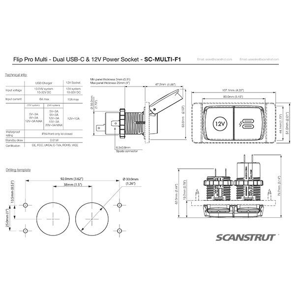 When not in use, the spring-loaded caps remain tightly closed, protecting the ports from the elements. Featuring a super-compact footprint, Flip Pro Duo is constructed from premium, marine-grade materials and is IPX4 waterproof, making it completely washdown-ready. IPX4 waterproof with the cover closed.