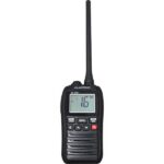 Floating waterproof handheld VHF radio with 5 W transmit power and exceptional clarity thanks to its noise reducer system. Features 12-hour battery life, USB-C rechargeable Li-ion battery, and automatic water-draining speaker function. Equipped with a large backlit LCD display (39 × 25 mm), illuminated keys, and float-and-flash safety with sound alarm and flashlight when immersed.